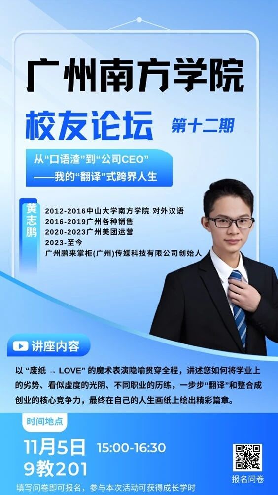 2025年11月5日,广州南方学院第12期校友论坛在9教201举行,我校2016届校友黄志鹏以《从“口语渣”到公司CEO——我的“翻译”式跨界人生》为题,为同学们带来了一场兼具温度与深度的成长分享。