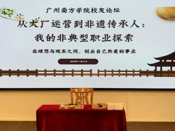 2025年11月21日,广州南方学院第13期校友论坛在6教106举行,我校2023届文化产业管理专业校友、广府谢家非遗制香技艺第六代传承人南卿云,以“从大厂运营到非遗传承人”为主题,分享了其独特的职业探索经历,为同学们传输了宝贵的职业成长经验。公共管理学院文化产业管理专业负责人、副教授周先捷老师,专升本学生第一党支部书记姚凡老师,人力资源管理系郭琦老师,辅导员王煦老师出席活动。