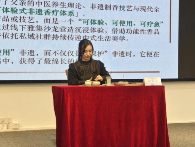 南卿云校友为现场师生带来了一场精彩的香道展示。她优雅地展示着传统制香工具,从理灰、压灰到置香、燃香,每一个都仿佛在进行一场与古人的无声对话。随着一缕青烟袅袅升起,清雅而醇厚的香气瞬间弥漫开来,萦绕在教室的每个角落。这一刻,非遗从她的手中“活”了起来,变成了可感、可触、可闻的温暖存在。