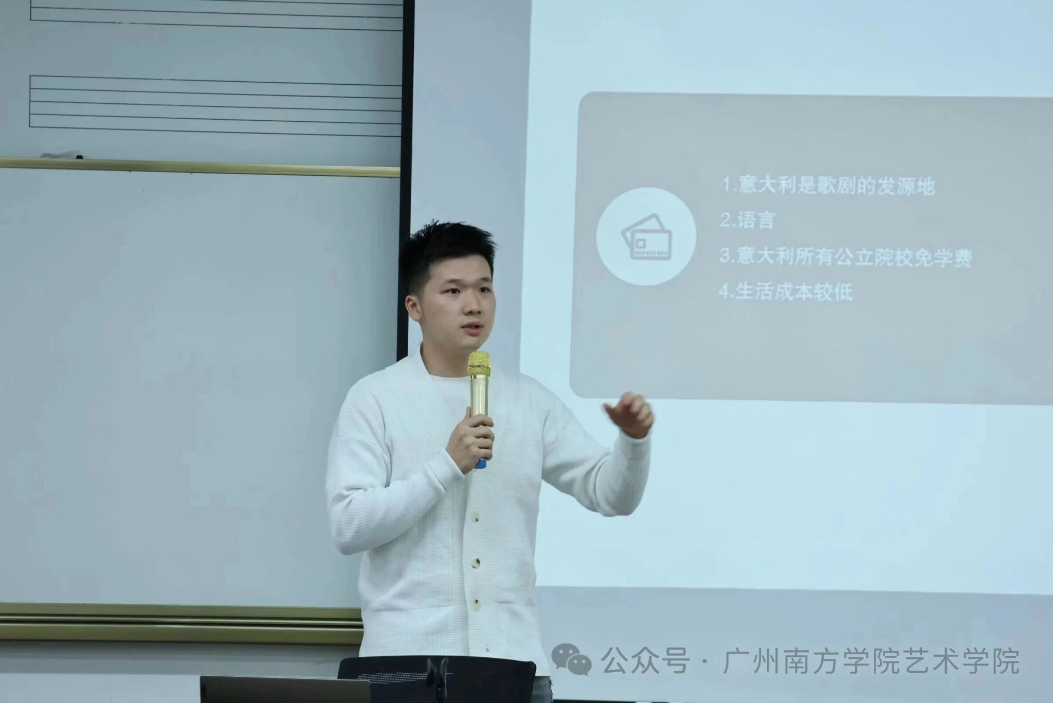 2016年,王世杰校友考入我校音乐系(现艺术学院),开启了属于他的大学时光。他介绍道,在校期间,学校优质的教学资源、完善的艺术设施以及老师们的悉心指导,为他的专业成长奠定了坚实基础。在大一大二阶段,他在扎实完成学业的基础上,积极参与军训、校庆活动、社团实践等各类校园活动,充分感受了校园生活的多元魅力与活力;进入大三大四,面对未来规划的迷茫,艺术学院徐静莹老师给予了他关键指引——不仅专程前往其家乡与家长深入沟通,更结合他的声乐专业优势,鼓励他通过海外深造拓宽发展路径。自此,王世杰校友明确了奋斗目标,利用课余时间往返广州强化意大利语学习,深耕声乐专业技能,为出国留学做好了充分准备。