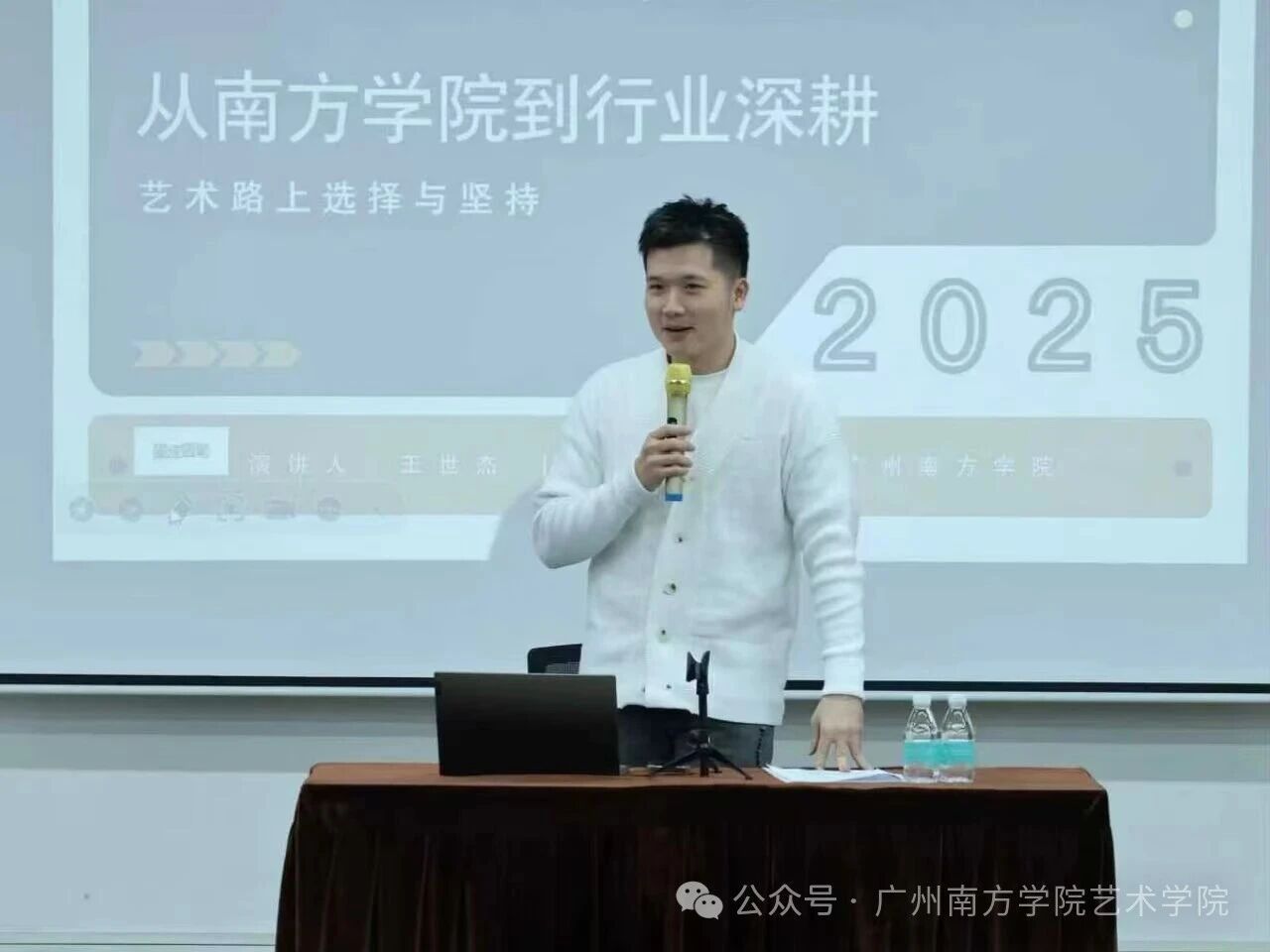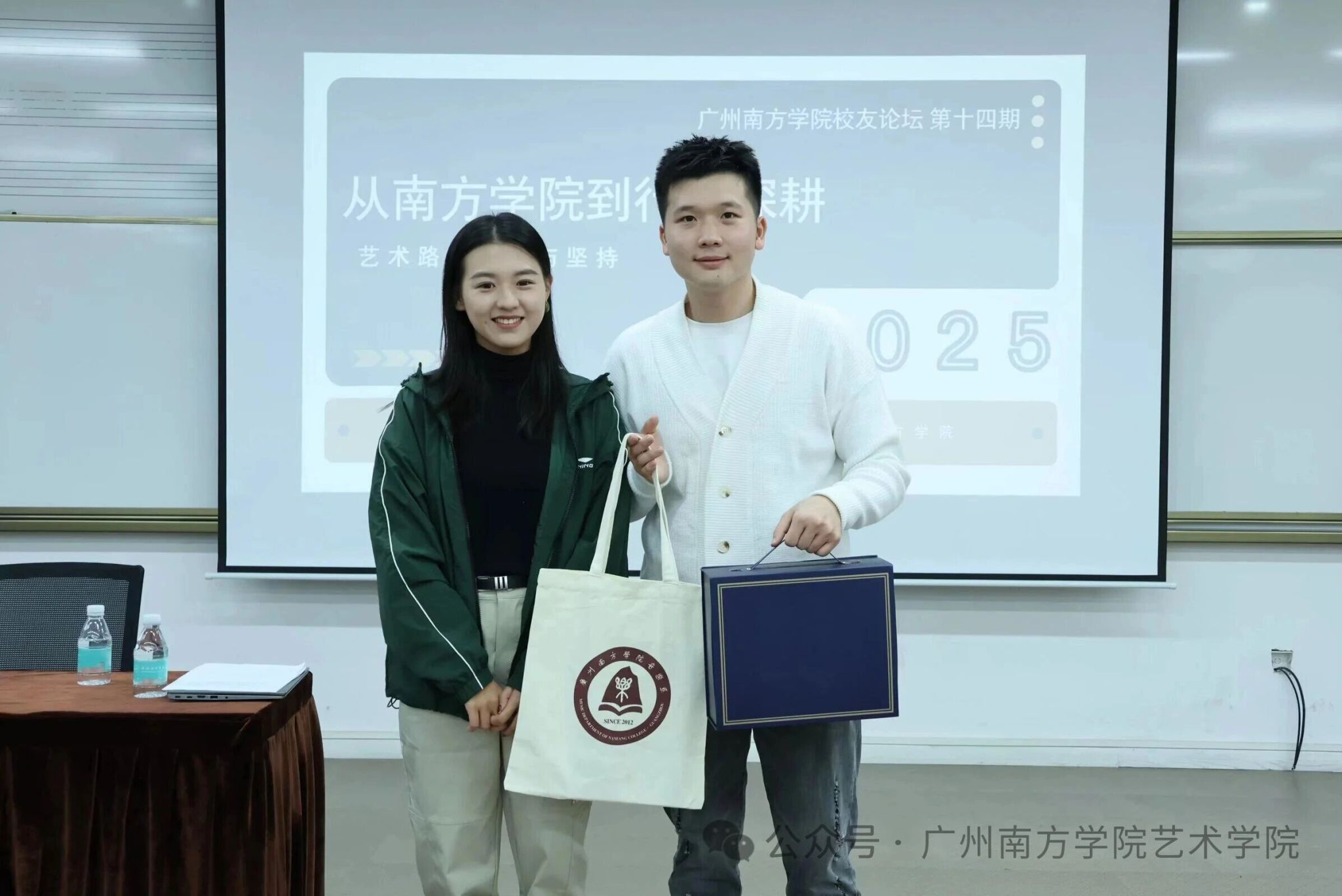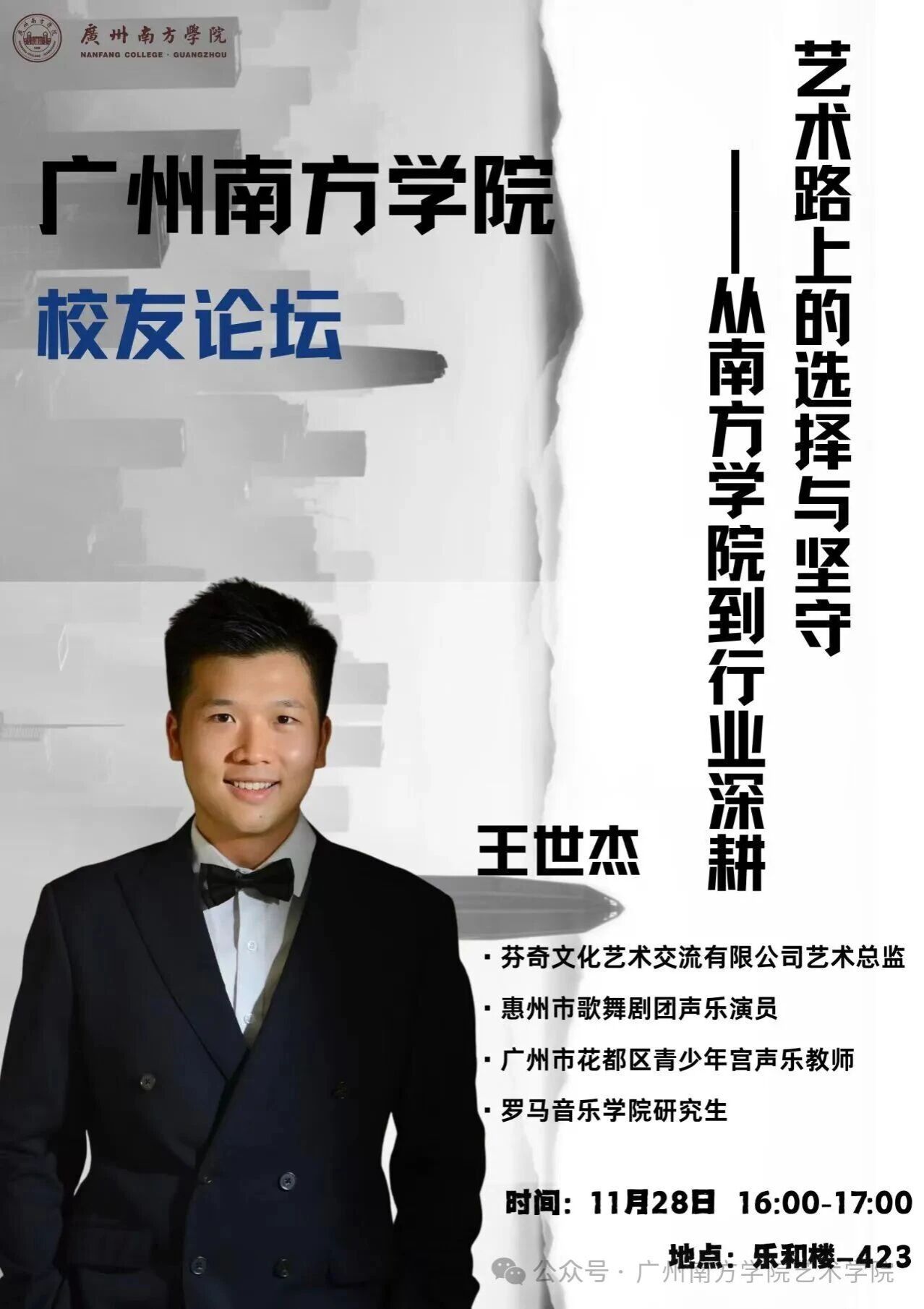 2025年11月28日,广州南方学院第14期校友论坛在乐和楼423举行。我校2020届音乐系校友、芬奇文化艺术交流有限公司艺术总监王世杰重返校园,以“从南方学院到行业深耕”为主题开展校友论坛。他结合自身从校园求学、海外深造到职场实践的完整历程,为在校生们讲述了一场生动的专业成长故事。