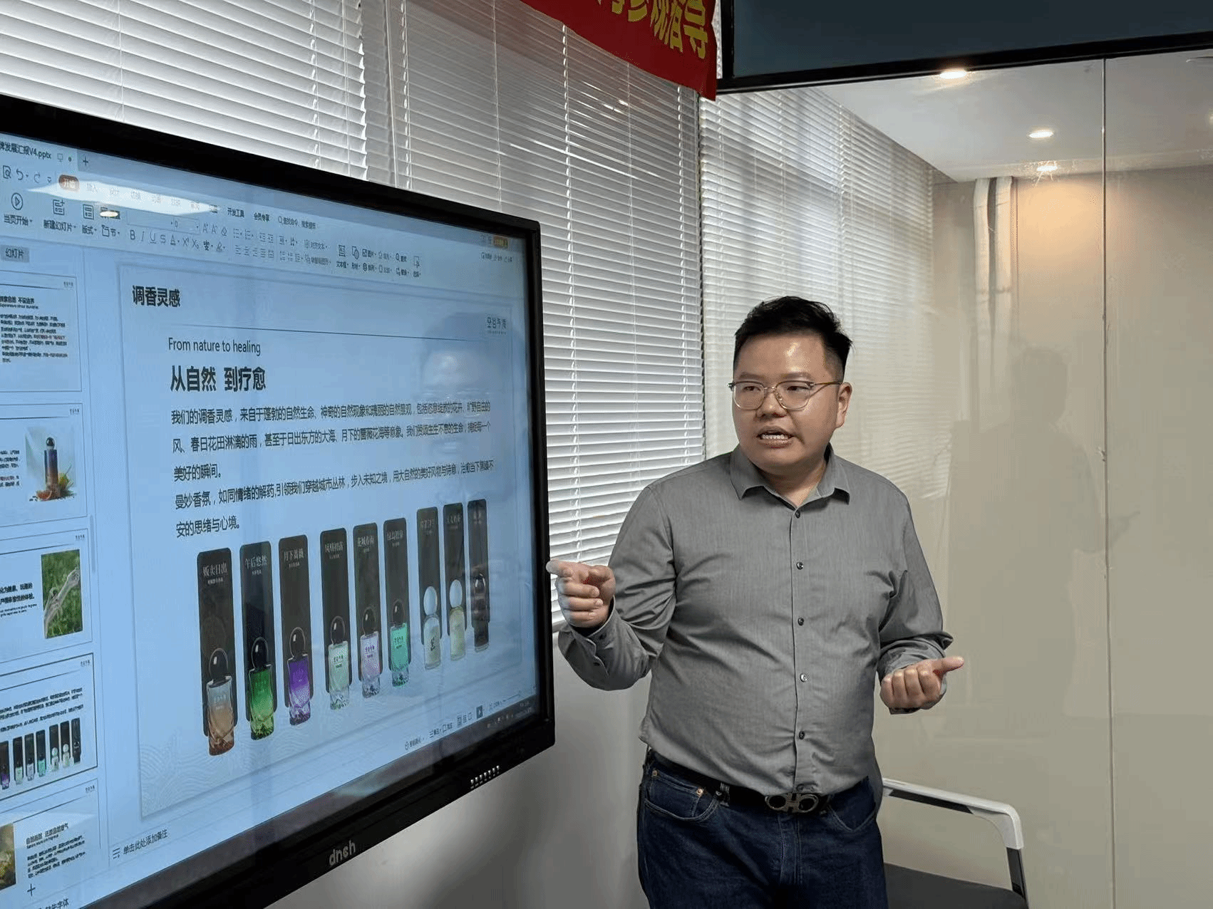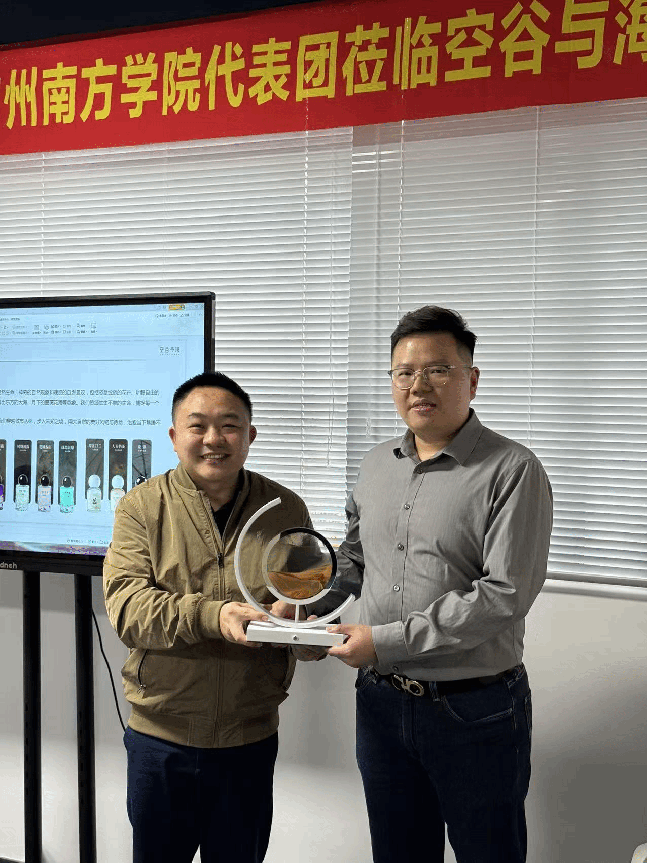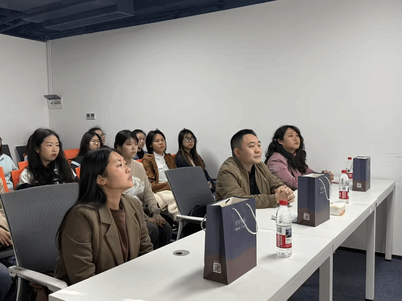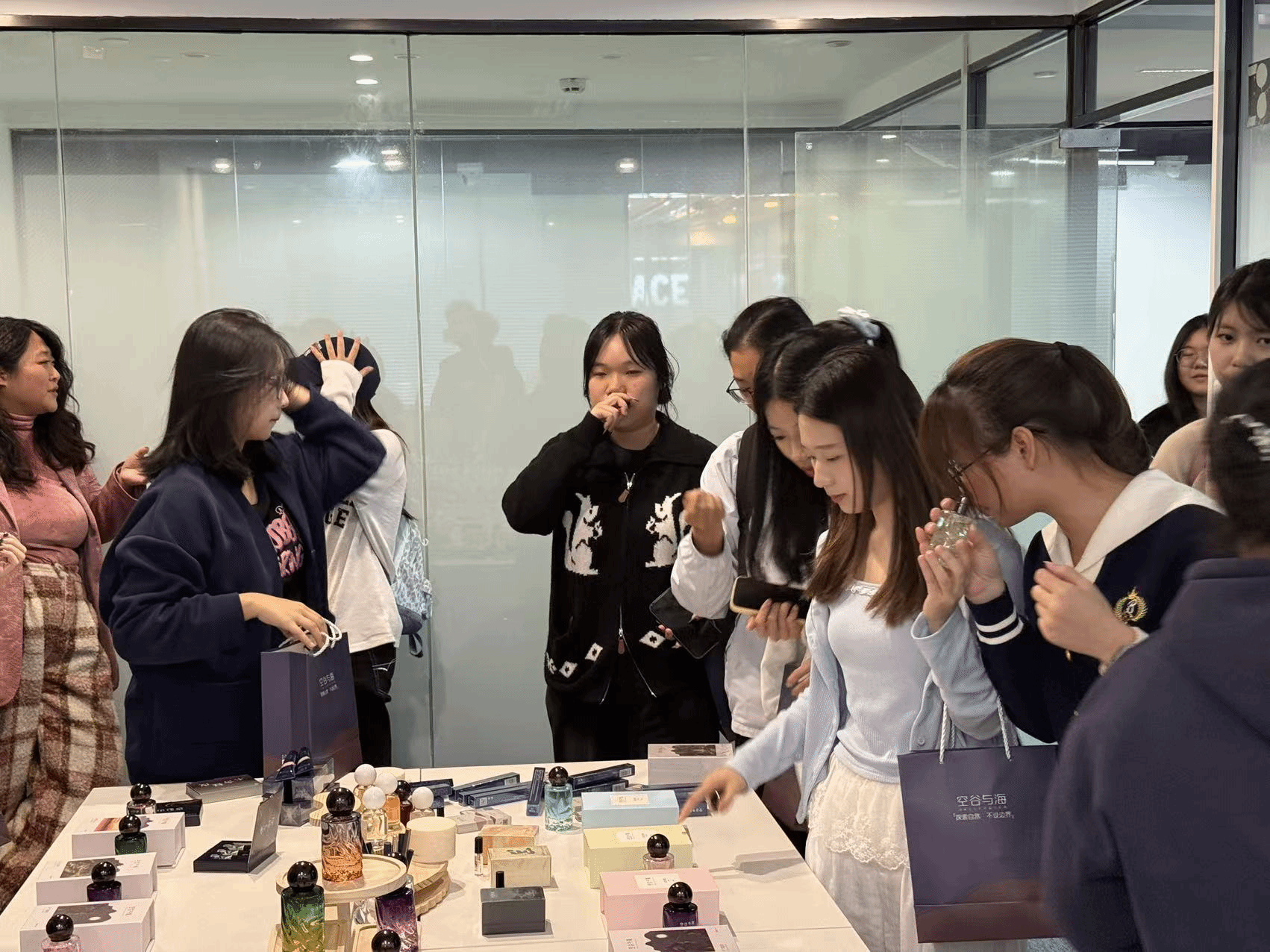 许伟彪校友对母校师生的到访表示热烈欢迎,他先向游学团介绍了公司的发展历程、组织架构和核心业务板块,随后带领大家观看了空谷与海的品牌历程,展示了品牌从初创到崛起的全过程,以及在产品研发、品牌营销、市场拓展等方面的成果。从香调研发灵感,到彩妆单品的工艺打磨,许伟彪校友逐一介绍了明星产品的研发理念和设计思路,每一处细节都让在场的同学们感受到空谷与海对产品品质的坚守。