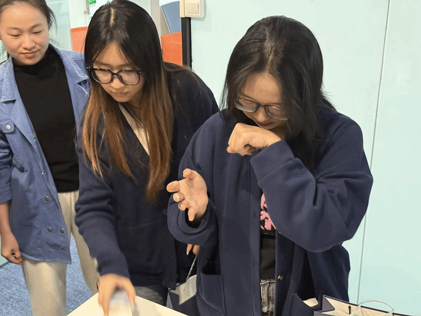 产品展示区里,琳琅满目的美妆产品搭配精致的陈列设计,也让同学们直观领略到国货美妆品牌的设计巧思与品牌魅力。“空谷与海坚持自然与愉悦的品牌理念,追求简单好用的产品,同时考虑市场定位与商业机会,瞄准一带一路沿线国家市场,将国货美妆向世界推广。”许伟彪在交流中这样说道。他还分享了自己创业过程中应对市场竞争、捕捉消费趋势的经验,让同学们深受启发。